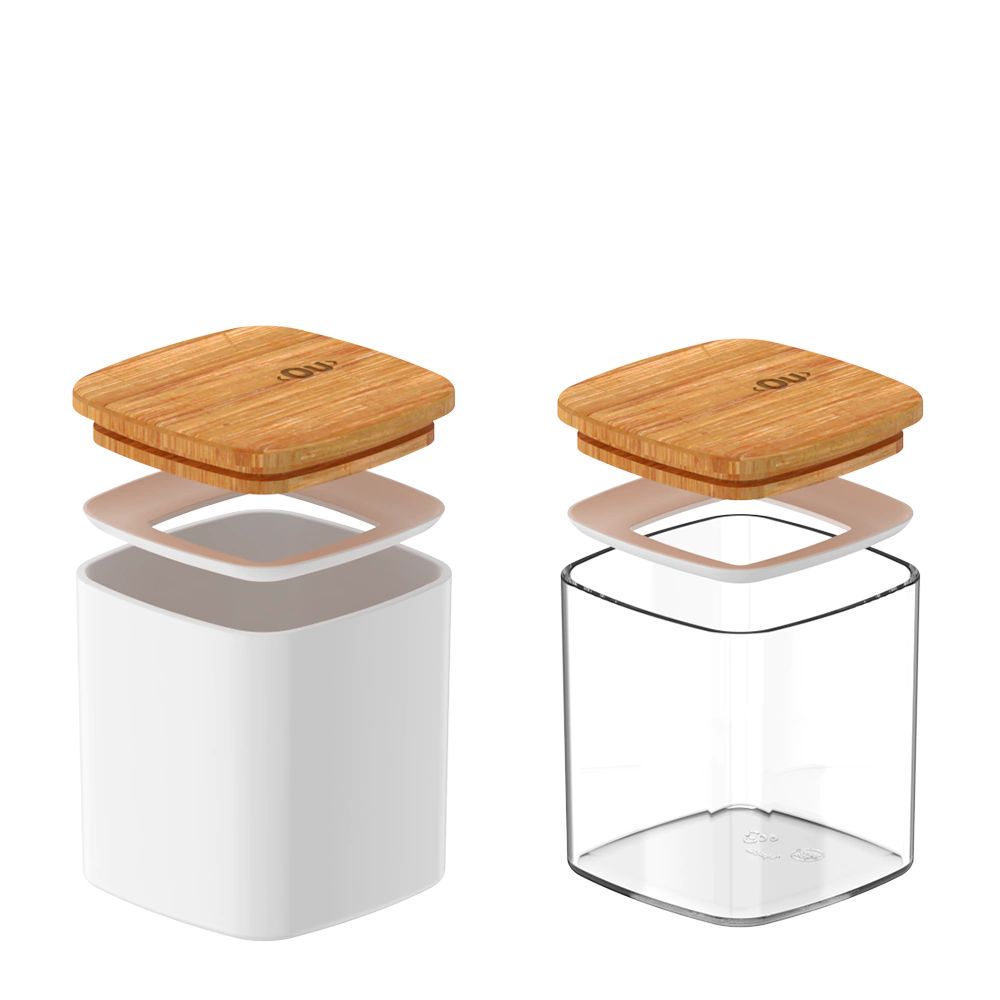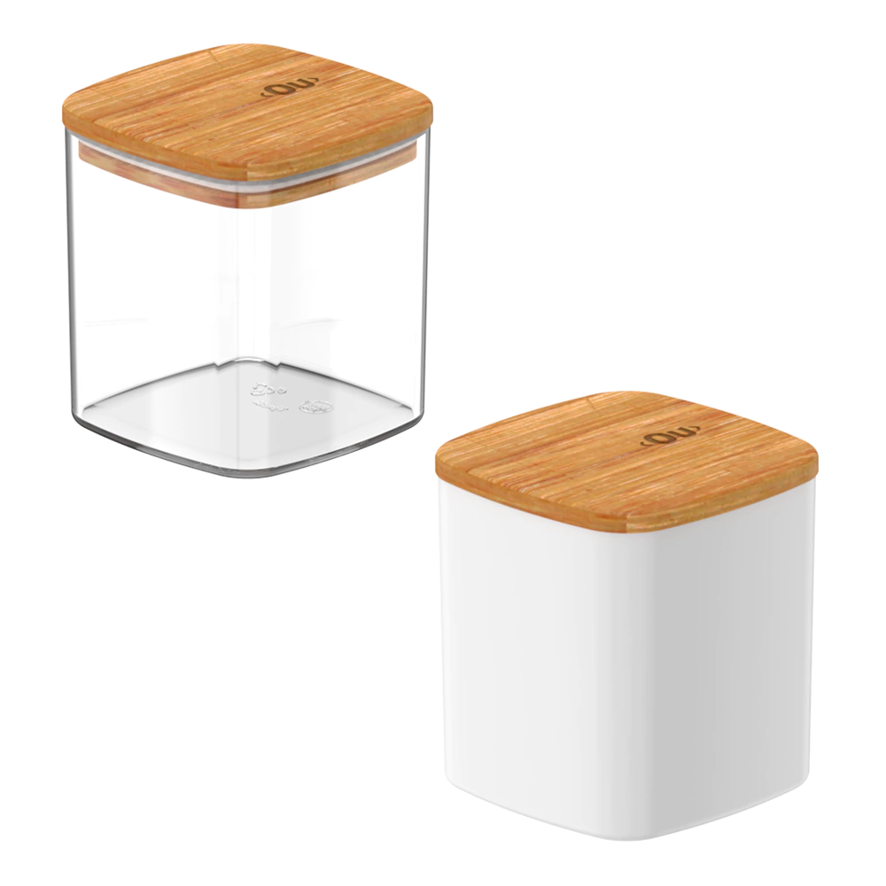 04 Potes Herméticos Keep 150ml (6,5 x 6,5 x 7 cm): Com tampas de bambu e vedação hermética, preservam o frescor dos alimentos por mais tempo, protegendo-os da luz e da umidade para uma conservação ideal.