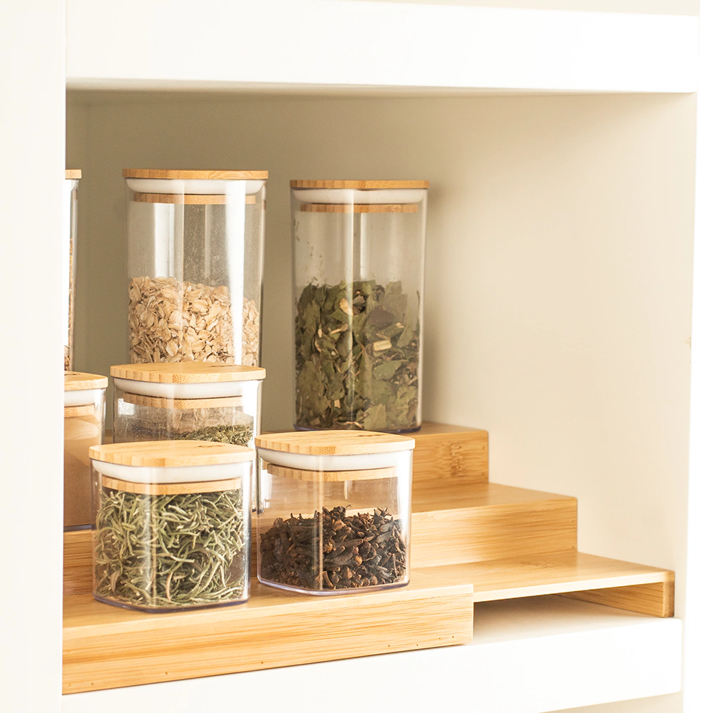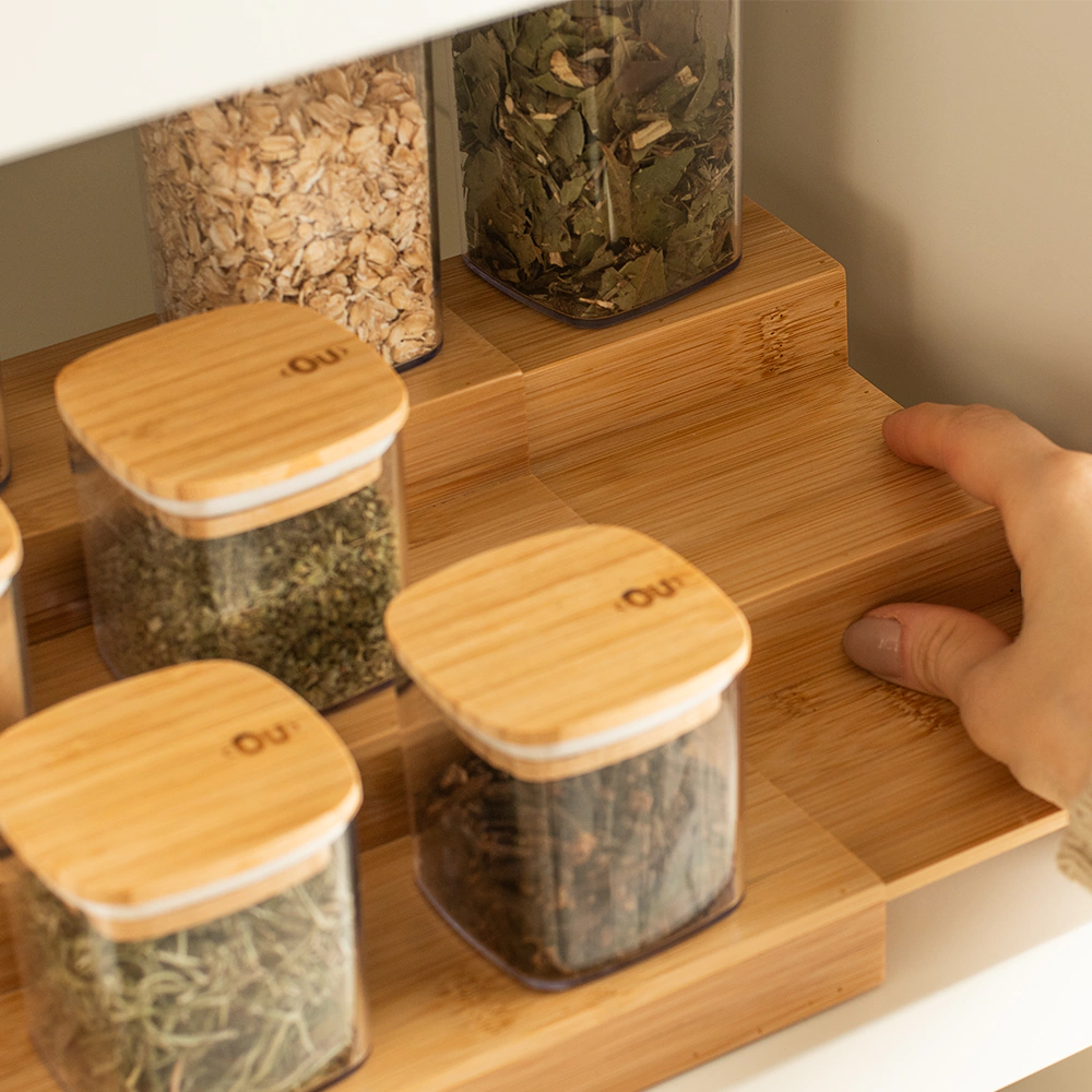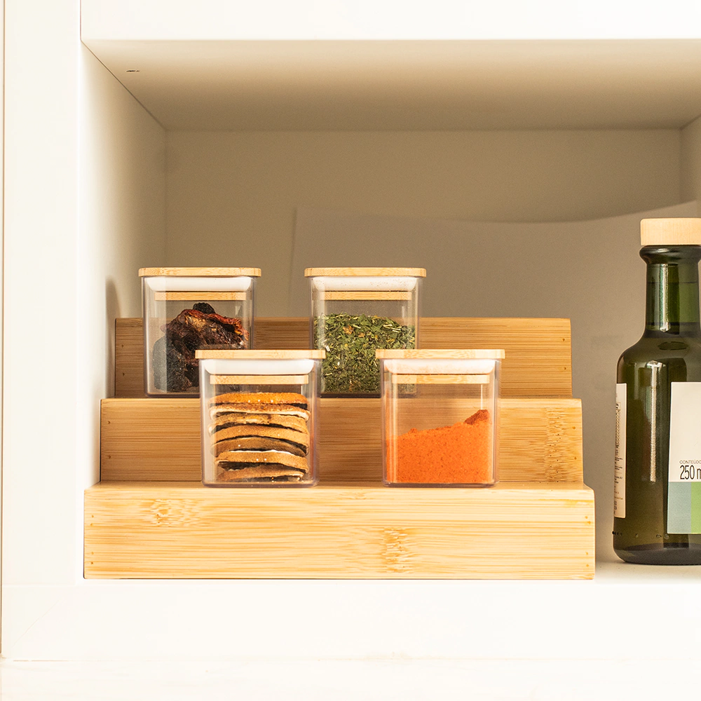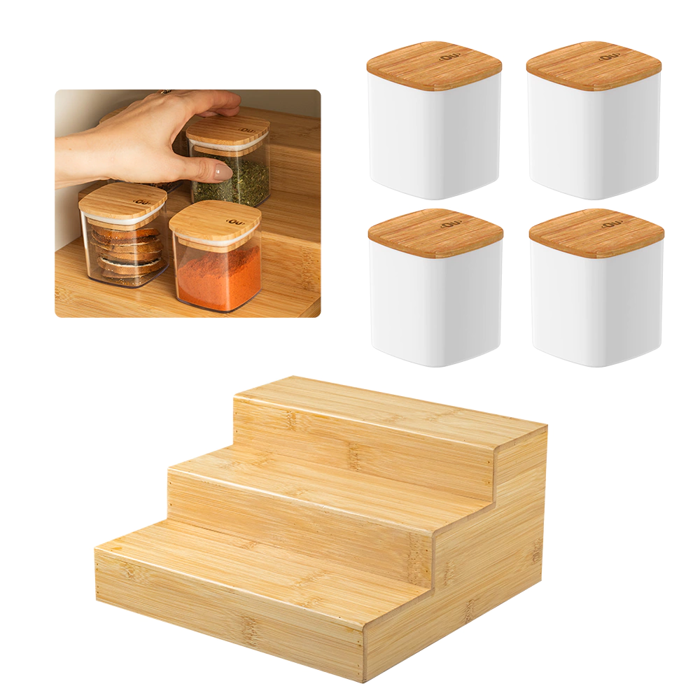 Esse conjunto sofisticado, feito em bambu 100% renovável, traz praticidade e elegância para otimizar o espaço e facilitar o acesso aos itens essenciais. Composto por um organizador multinível e 4 potes herméticos de 150ml, este kit promove uma rotina mais organizada e sustentável, ideal para manter temperos e outros ingredientes ao alcance.
