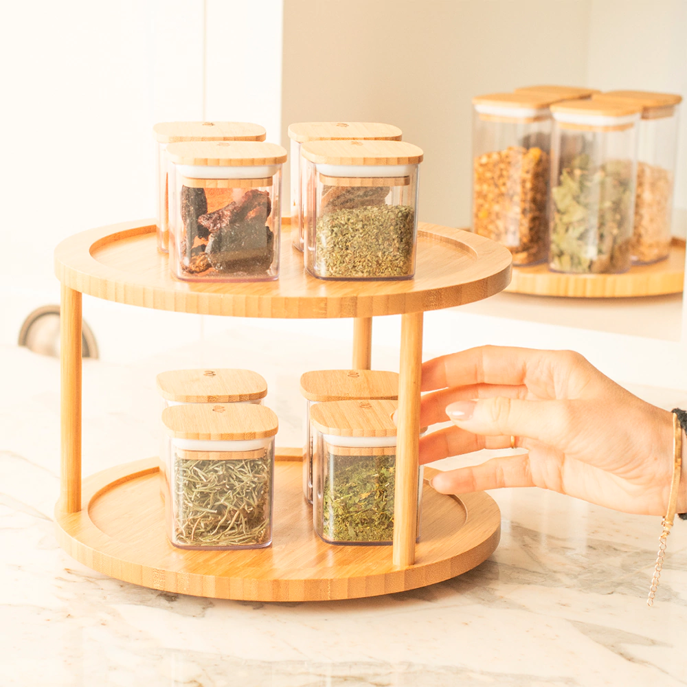 01 - Organizador Giratório Keep Bambu (25 x 25 x 2,5 cm): Sistema giratório de 360° para organizar e facilitar o acesso aos itens, perfeito para quem busca uma rotina mais prática e organizada.