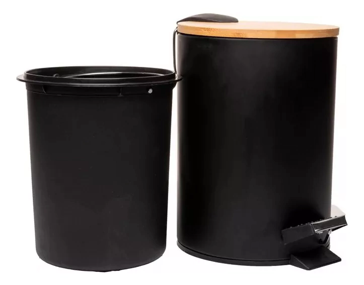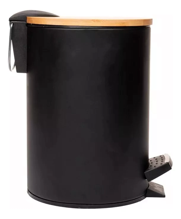Apresentamos a Lixeira Redonda de Metal com Pedal e Tampa em Bambu Preta da Lyor, uma peça elegante e funcional para atender às suas necessidades de descarte de resíduos.