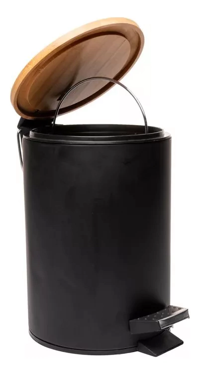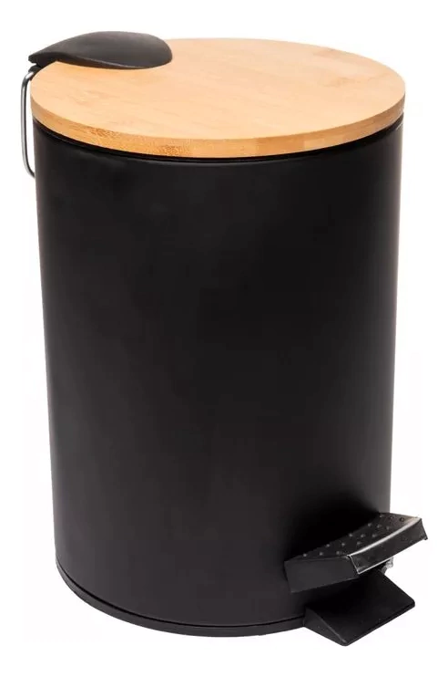 Lixeira Redonda de Metal com Pedal e Tampa em Bambu Preta 3L - Lyor