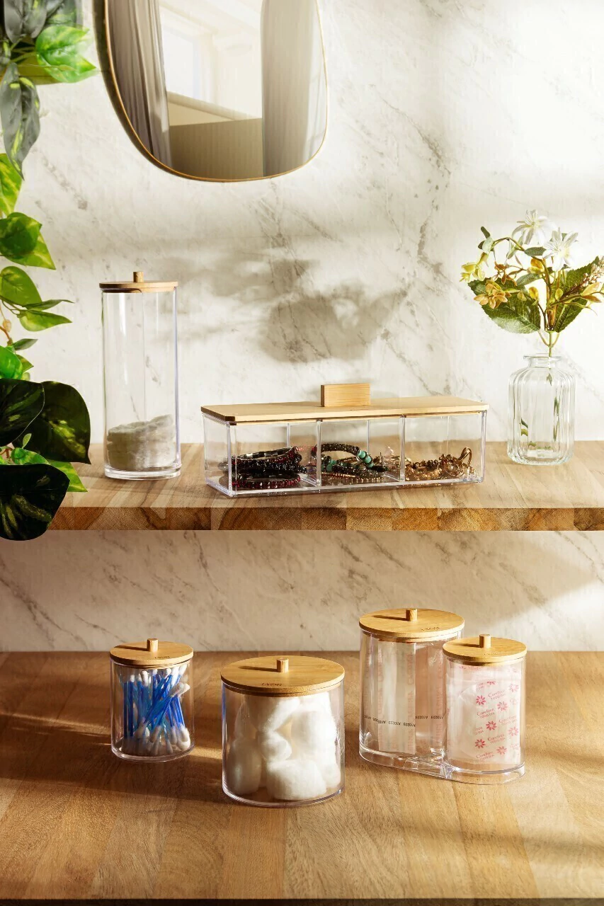 Material de Alta Qualidade, Combinando poliestireno durável e uma tampa de bambu, este porta algodão oferece resistência e um toque de elegância ao seu ambiente.
